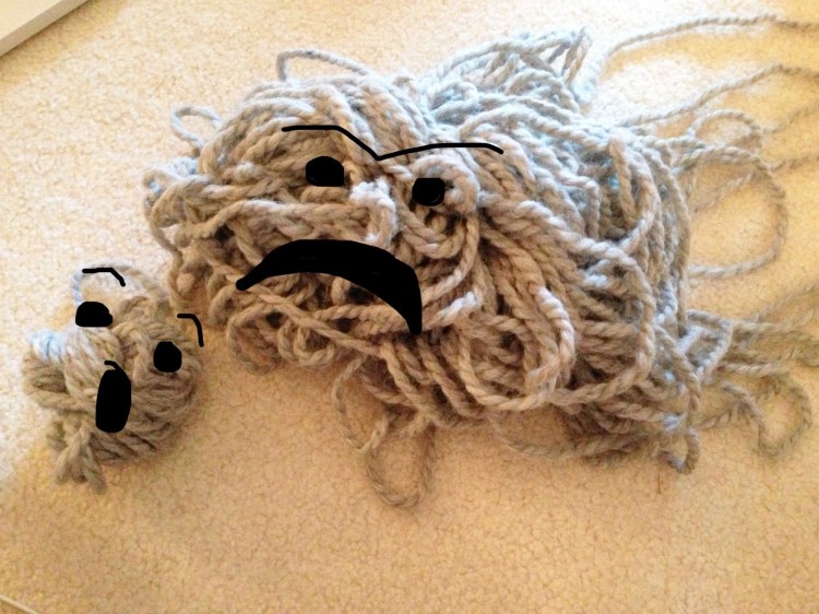 This is the once-beautiful skein of ultra-soft yarn that resided at the bottom of a yarn stash for an undetermined amount of time with no tag to indicate yardage, dye lot, company name, or anything else indicative of where to go to buy more, how long ago it was made, or how much there is. The last time I was in possession of such a hopeless tangled mess it was a skein of worsted I bought at Target when I was nine. I was knitting a pillow at the time so I just shredded it and used it for stuffing. But this is nice stuff.
