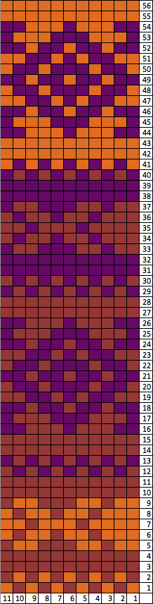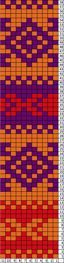 Repeat rows 1 and 2 until purple section measures 8” from row 69.