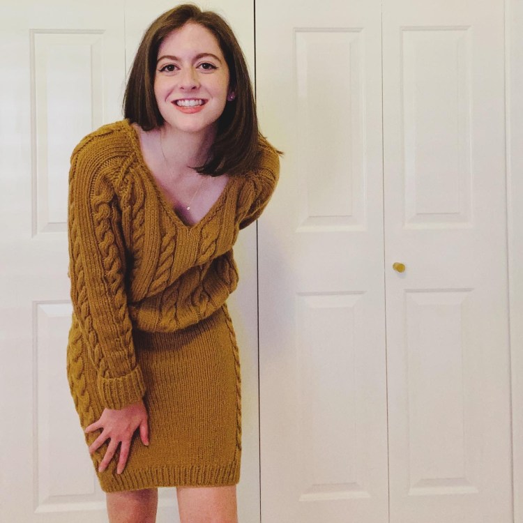 Repeat row 5 until skirt measures 20″ ending just before cable row in Braid Pattern. Switch to size 8 circular needles.