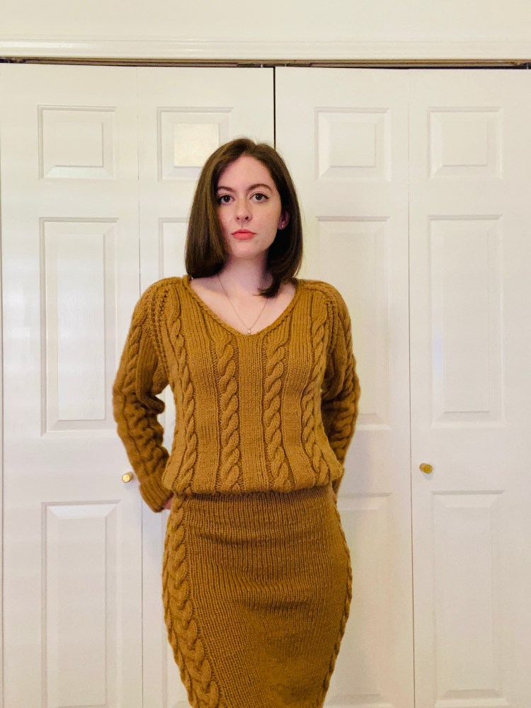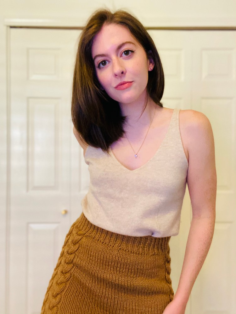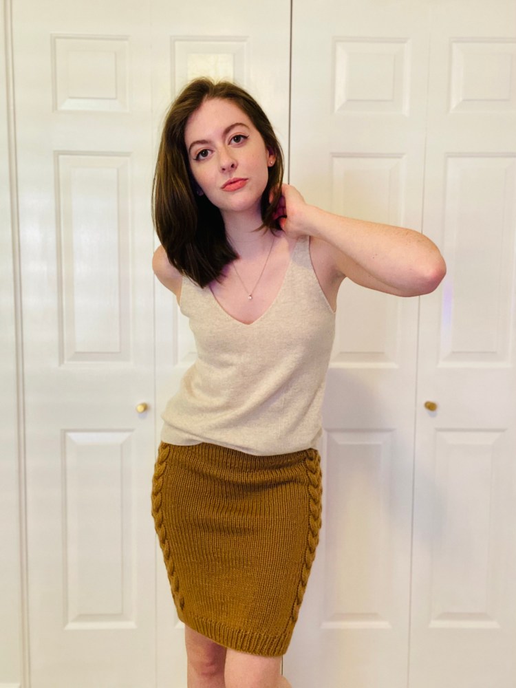 My knitwear closet is a little top-heavy, so I decided to whip up a pencil skirt for a little professionalism. Luckily, a v-neck sweater I knit in February left me with four skeins of chunky beige worsted, although I wouldn’t usually be working with wool in the heat of a Georgia spring, aka first summer, it gave me a nice sturdy material to work with.