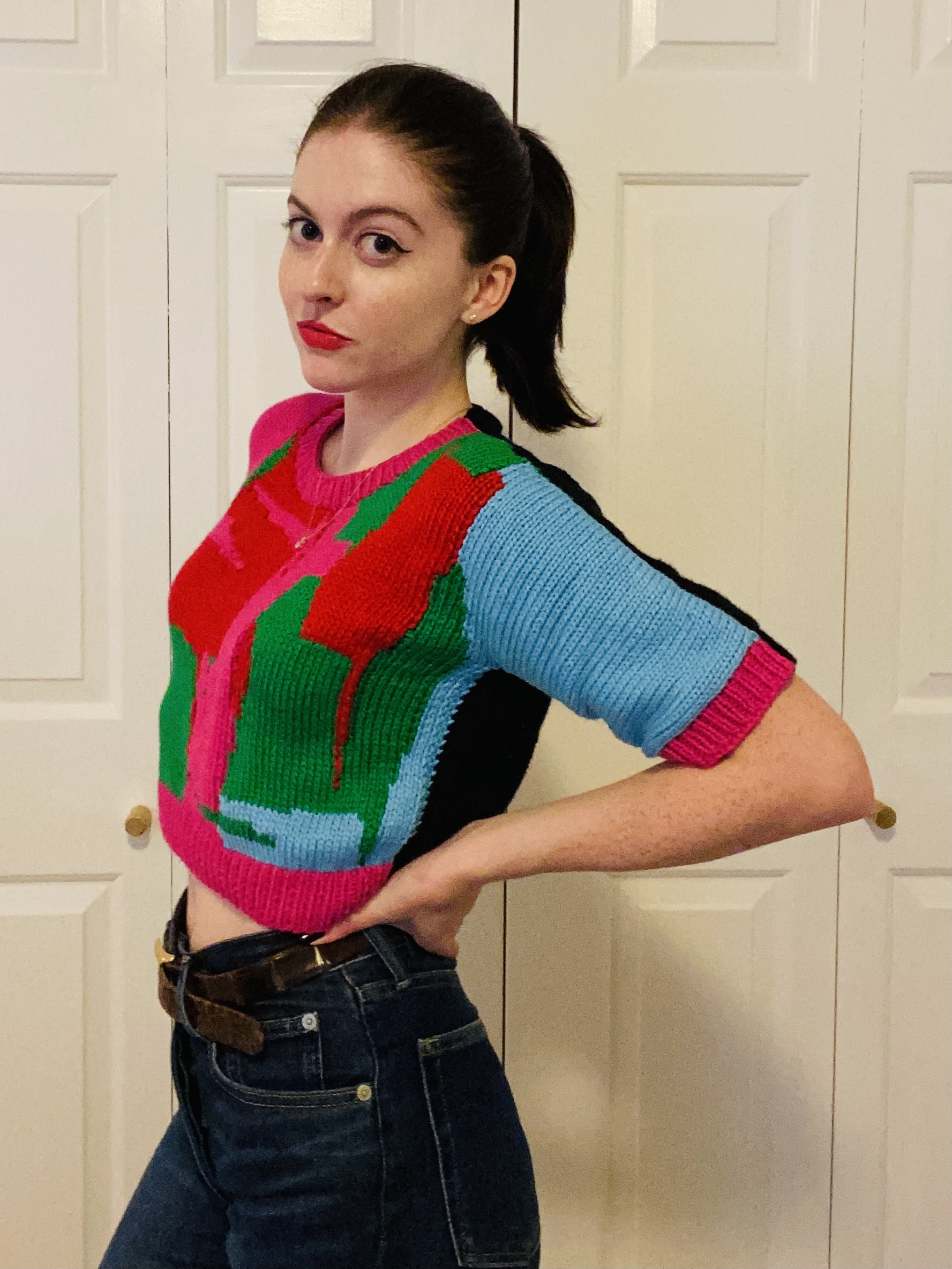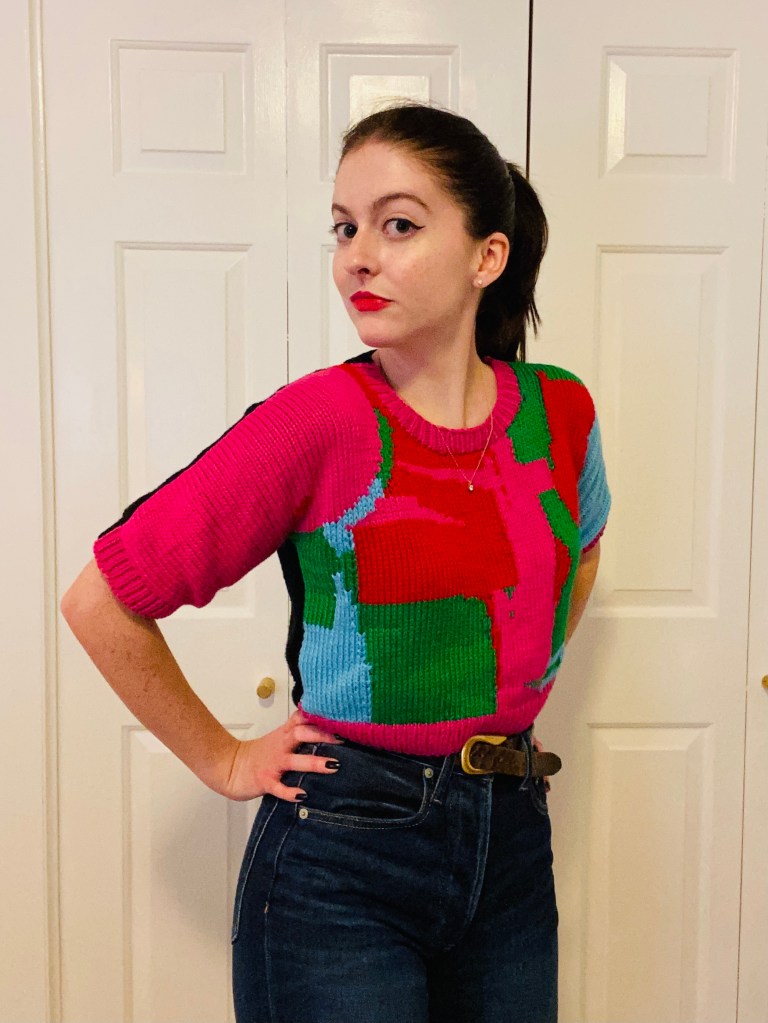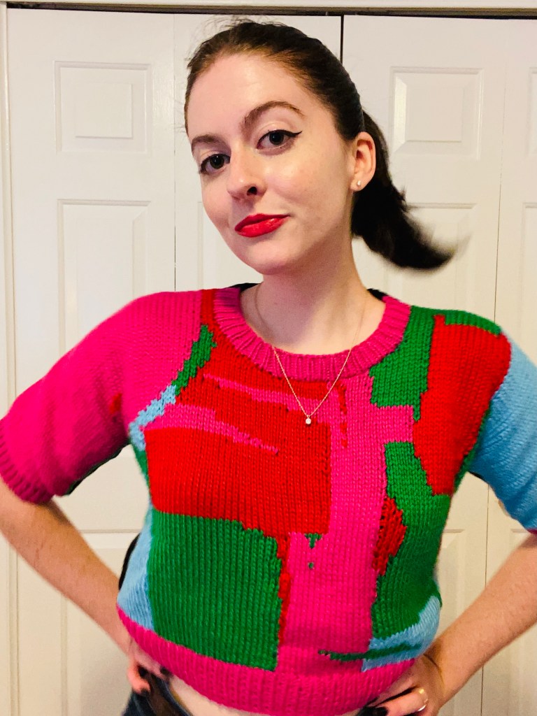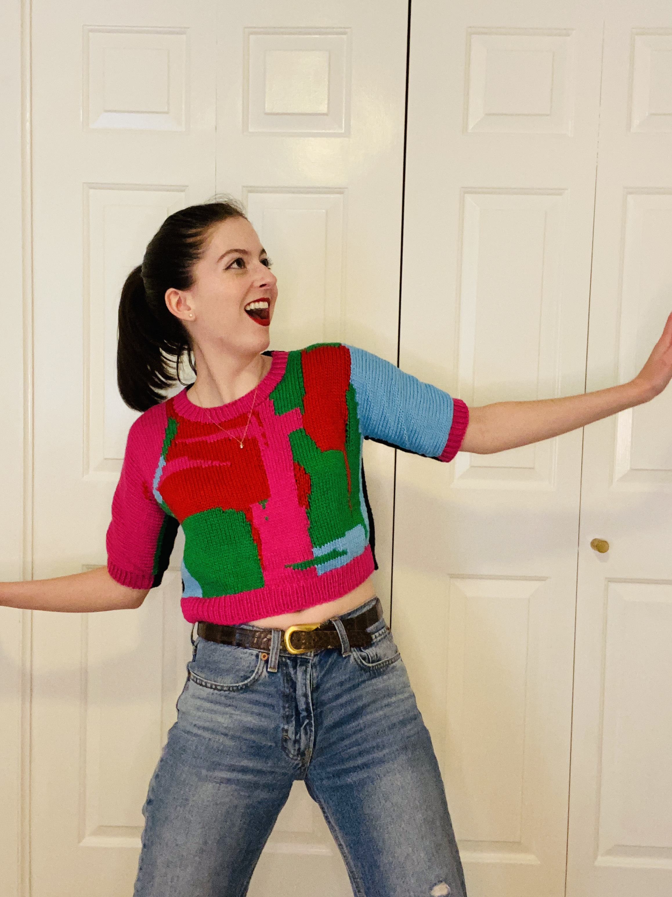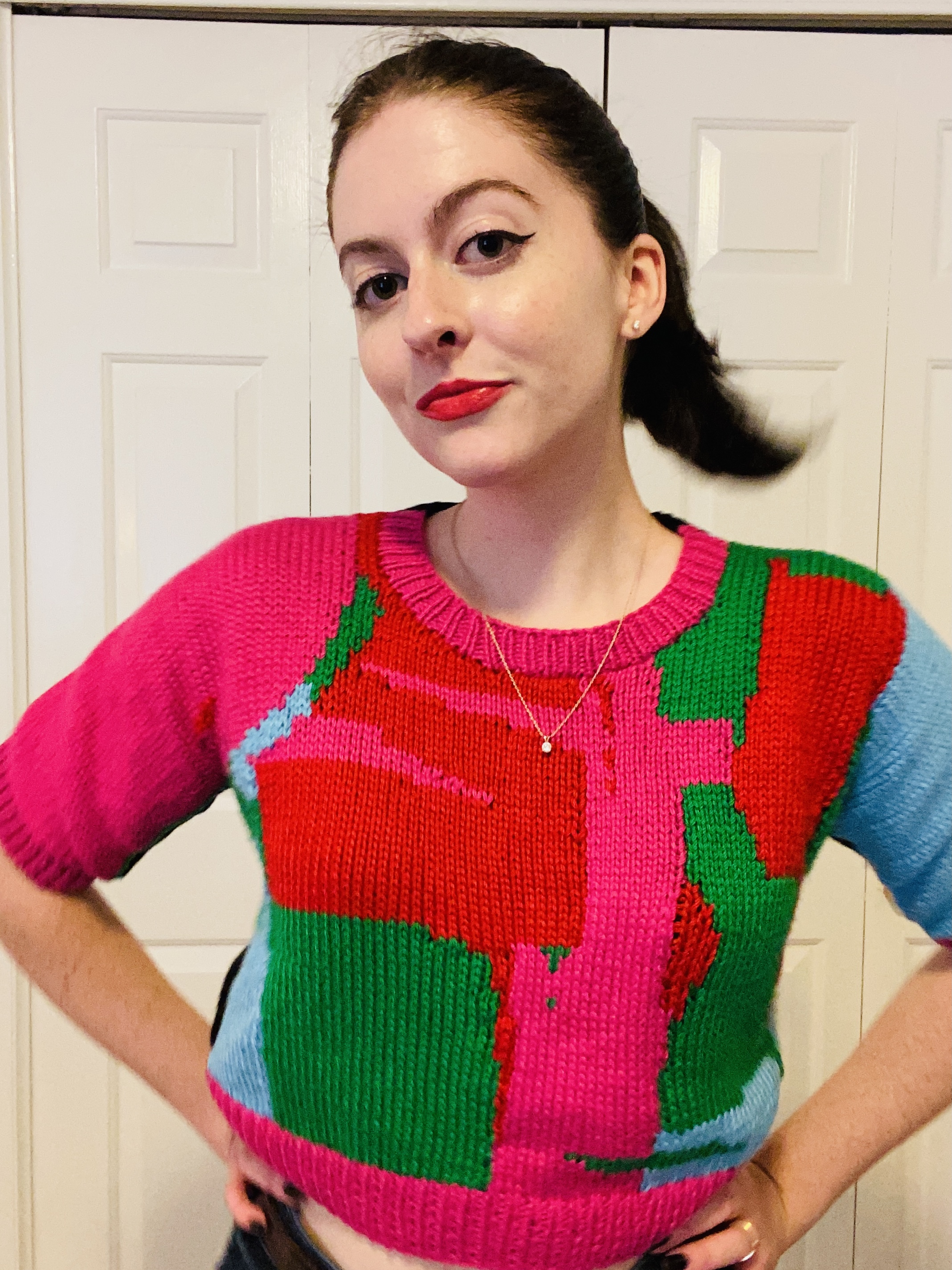 I didn’t study much my senior year in college. Instead, I spent a solid chunk of my time painting abstracts with tiny brushes on five inch squares of canvas. I see painting now as a form of meditation – clearing my thoughts to focus on swirls of complementary color. But back then, as my rickety six inch greeting card easel toppled face down – wet paint meeting marble-slab-desk over and over – it may have been closer to non-threatening mania. At some point in between brush strokes and handfuls of sour patch kids, I opened an excel spreadsheet, and mapped out an abstract color work pattern. I thought about knitting a t-shirt, or a blanket, or a pillow like the painted ones my parents kept in their foyer, and then I did nothing.