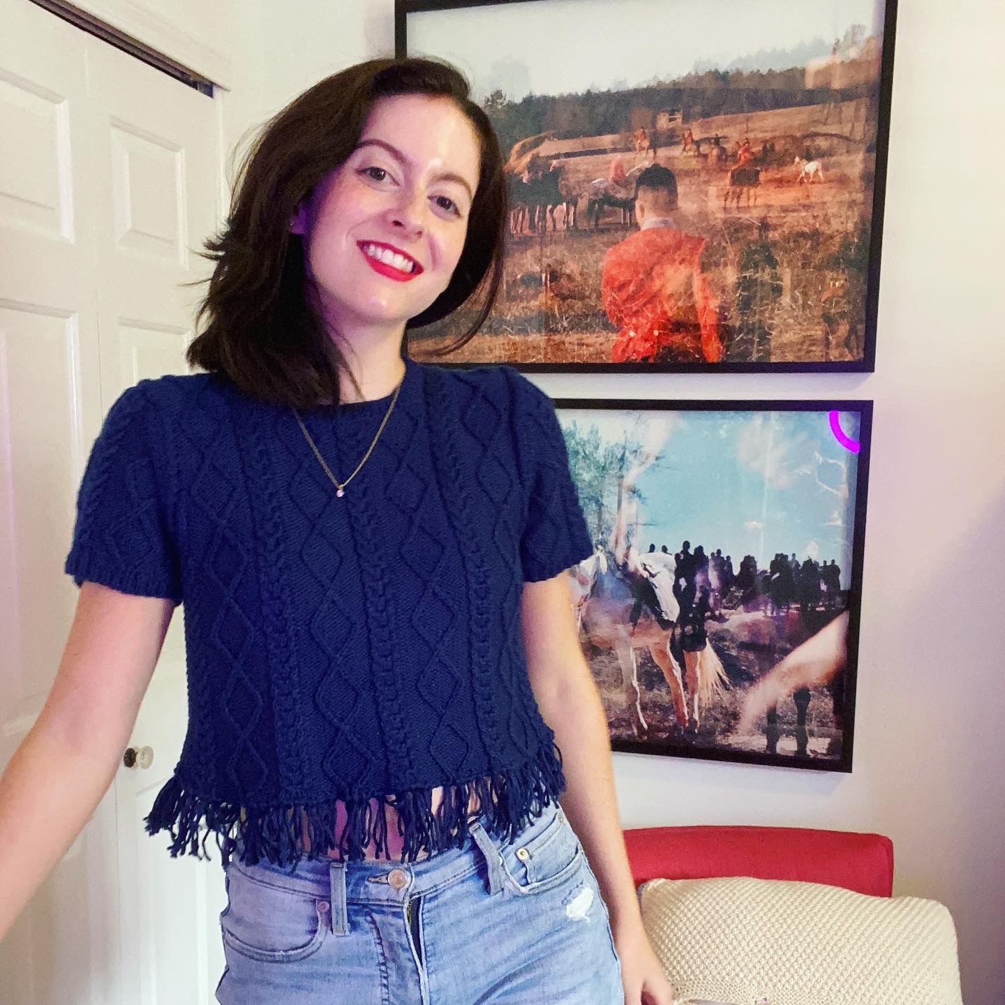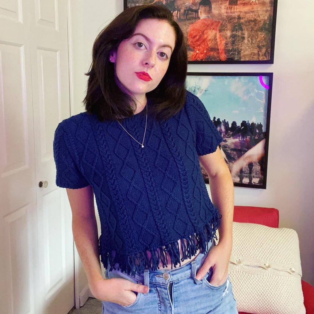 I’m not sure if this is a top or a mixed media project, but it’s the closest I’ve gotten to a shirt I ruined at an ice cream festival in 2018. The original was a soft white tee, cropped at the waist, with tassels sewn to the bottom. Although I realized while I was working on this pattern, that it was the spiritual successor the kids shirts my mom made as party favors back in the late 90s – Hanes t-shirts with ribbon and Hobby Lobby ball fringe sewn to the bottoms. This is the sweater equivalent of buying ribbon spools from a sweet old lady in a vest.